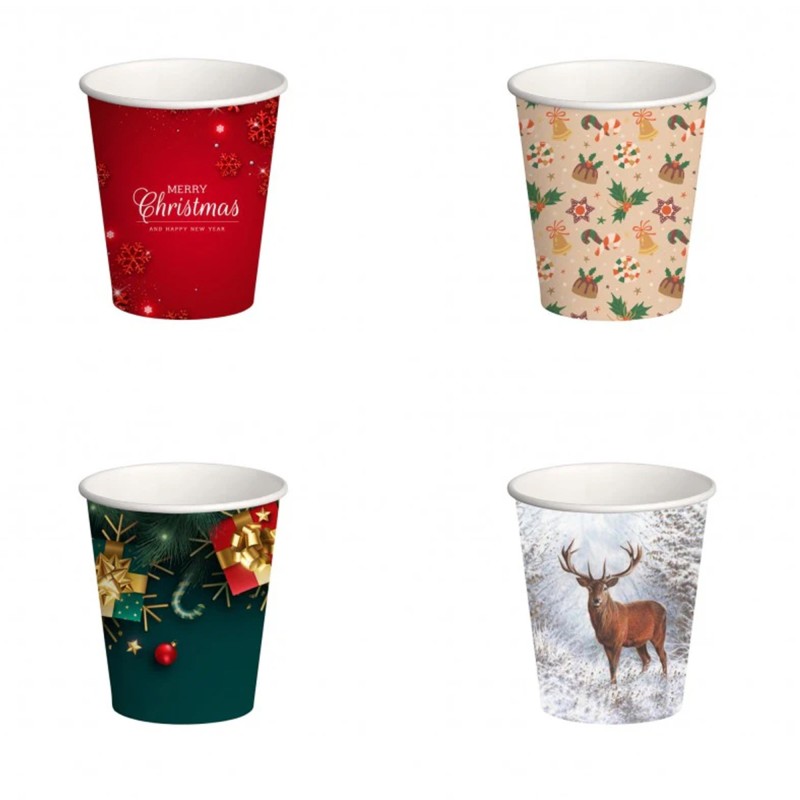 50 Pezzi - Bicchieri d'Acqua in Carta Natalizi, 180 ml, Quattro Colorazioni, Biodegradabili e Biocompostabili
