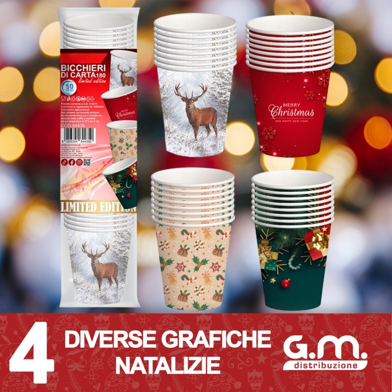 【CONTENUTO】: 50 Bicchieri in Carta con Grafiche Natalizie da 180 ml, Biodegradabili Biocompostabili, Usa e Getta