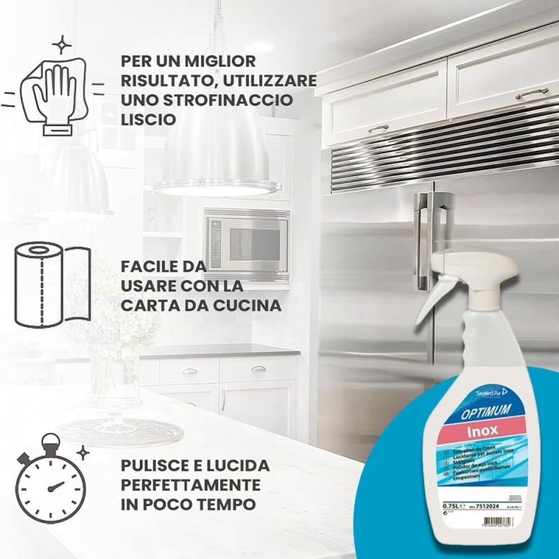 Optimum Inox è un lucidante a base di oli speciali, appositamente formulato per superfici in acciaio inox che non vengono utilizzate per la preparazione di alimenti, come refrigeratori, sportelli di congelatori, carrelli e lavastoviglie. La speciale miscela di olii assicura una prolungata protezione dallo sporco e rende le superfici brillanti.